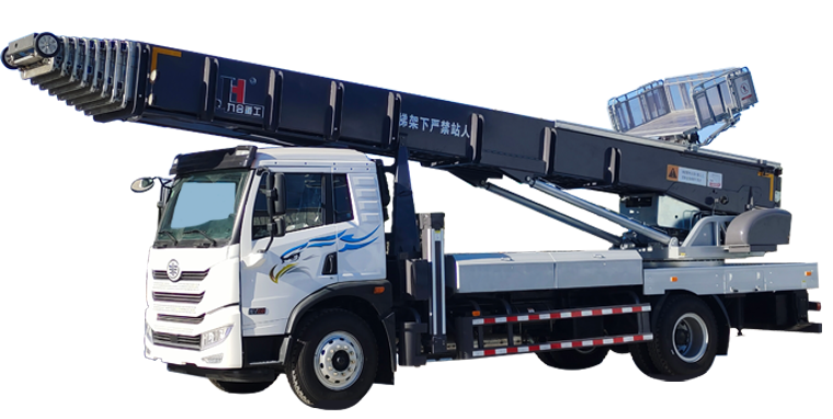 36米云梯車可傳送 400kg 重的貨物,用于高度小于36 米的高空裝卸作業(yè)。該云梯車主要由車架總成、云梯總成、小車總成、轉(zhuǎn)臺總成、卷揚(yáng)機(jī)總成、液壓系統(tǒng)總成、電氣系統(tǒng)總成等組成。傳送貨物時(shí),4 個(gè)液壓支撐伸出,加強(qiáng)了整機(jī)的穩(wěn)定性。 該云梯車,采用一汽解放底盤,整車重量控制在4.5噸以內(nèi),掛藍(lán)牌,C1駕照就可駕駛,免購置稅,不需要操作證,非營運(yùn)車輛,使用期限30 年。